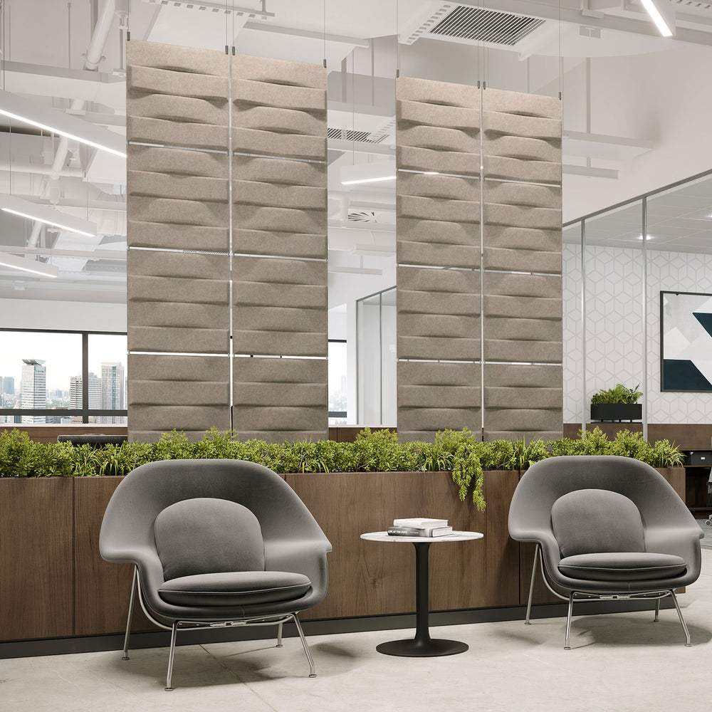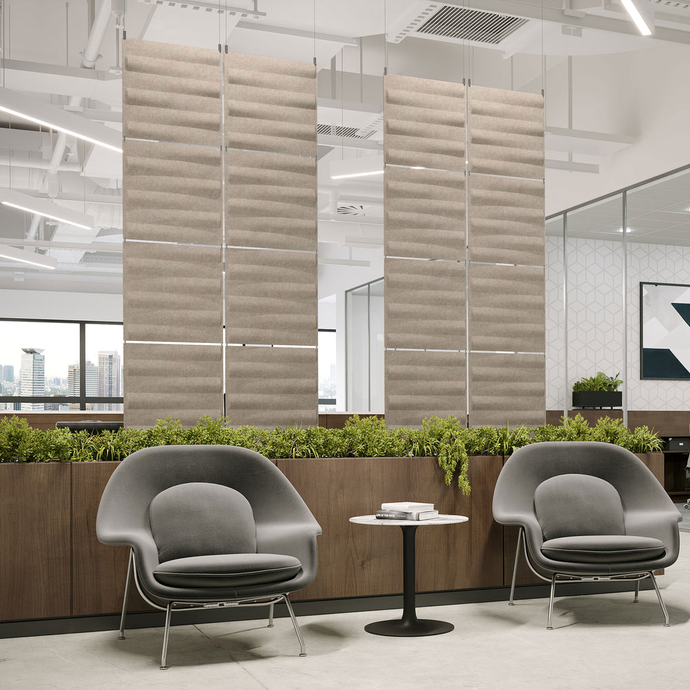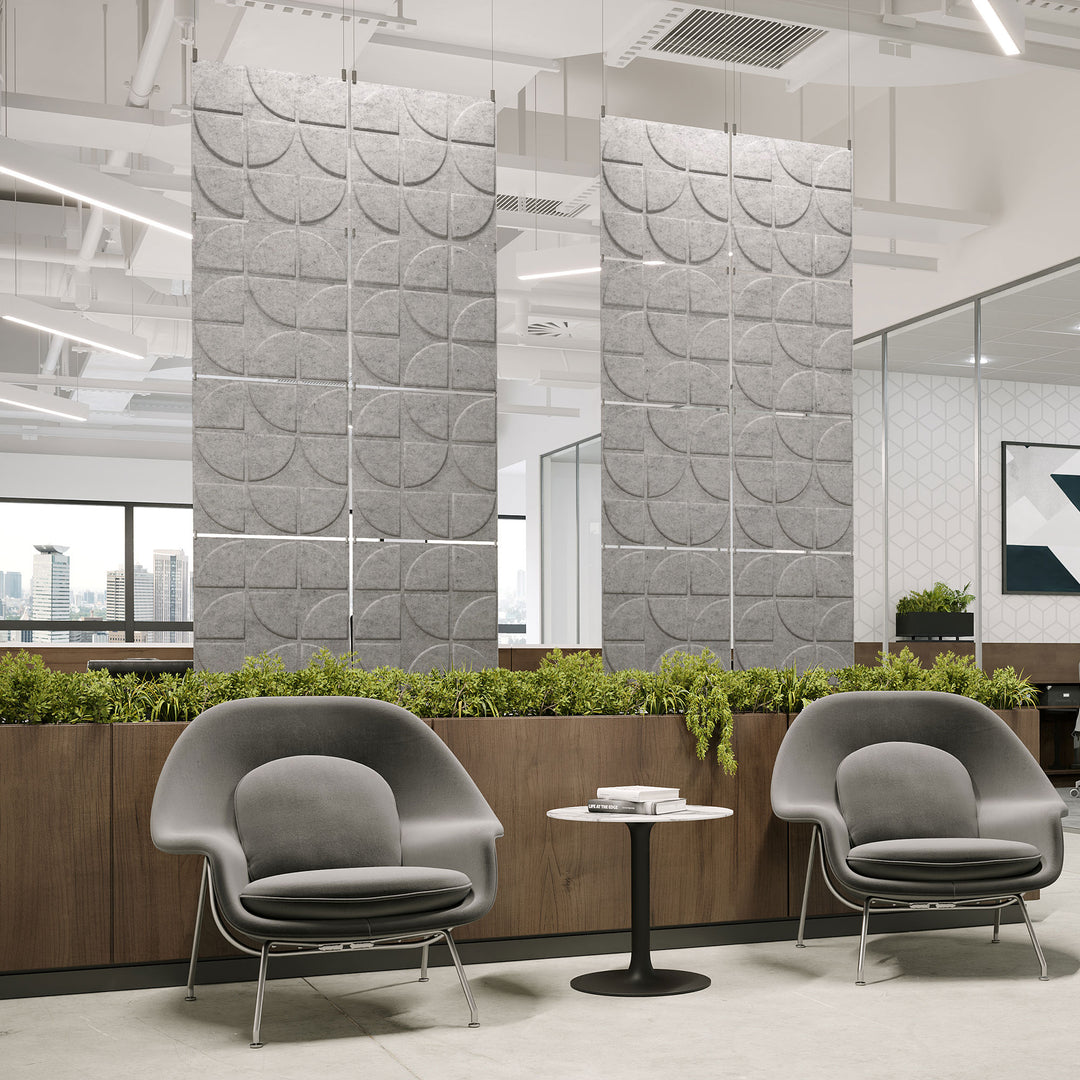 Our Hanging 3D Wall Flats turn your accent wall into modern wall art. Our easy DIY Hanging 3D Wall Panels are available in a paint ready finish or acoustic PET felt finishes that can be hung against a wall to create dimensional modern wall decor or hung as acoustic room dividers with our double sided system.